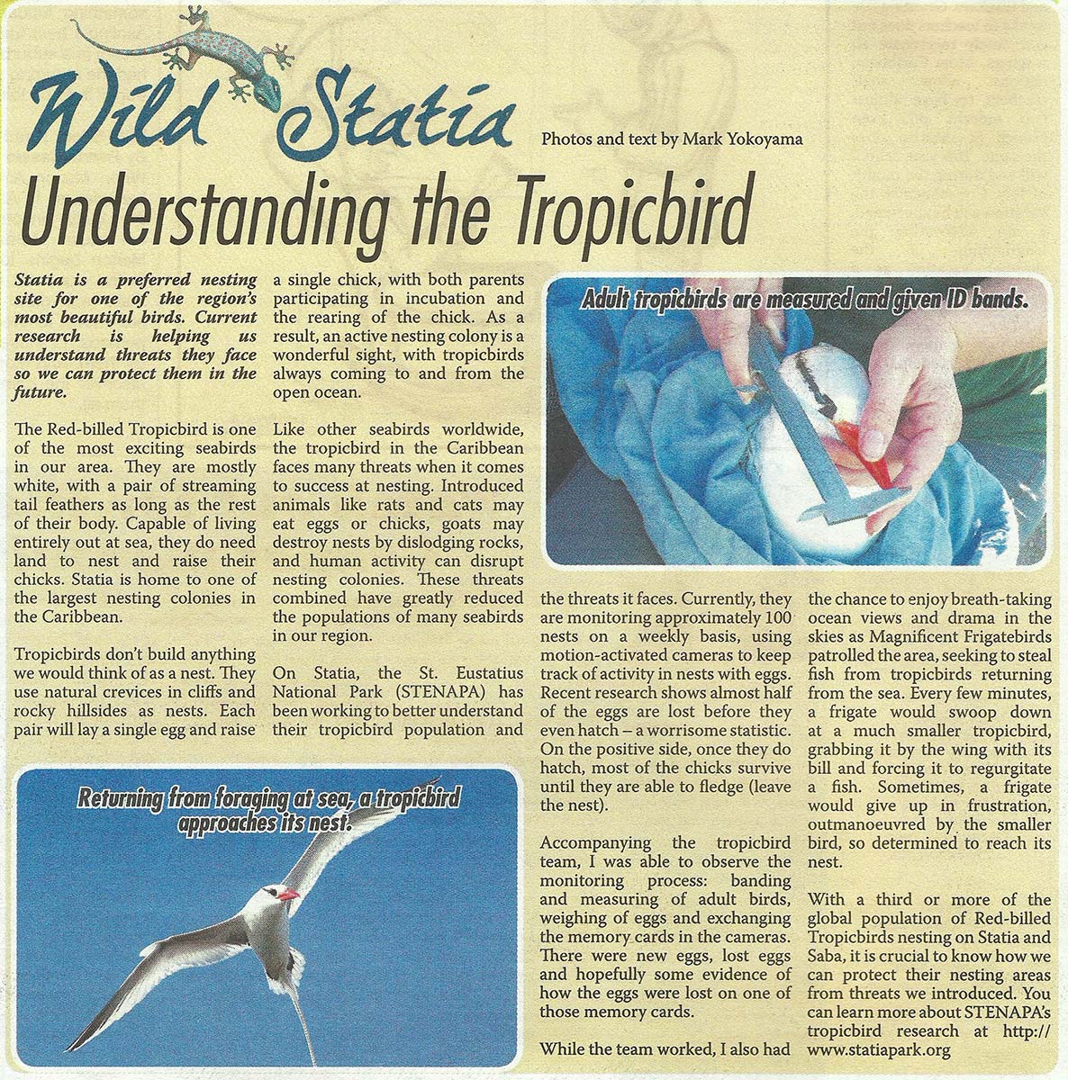 Wild Statia: Understanding the Tropicbird February 1, 2015February 1, 2015 by Mark The latest Wild Statia article takes a closer look at the Red-billed Tropicbird, the importance of Statia to our local population of this bird and the research being done to understand it better.
